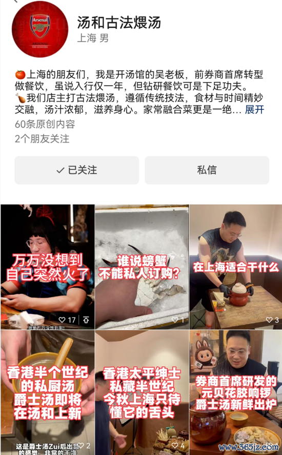 另外,近期视频号“汤和古法煨汤”爆火。主持东说念主自称吴雇主,系“前券商首席转型作念餐饮”。据悉,该名“吴雇主”是天风证券原纺织服装行业首席分析师吴骁宇,曾在湘财证券、民生证券、中泰证券等券商担任分析师,主要遮掩纺织服装行业。