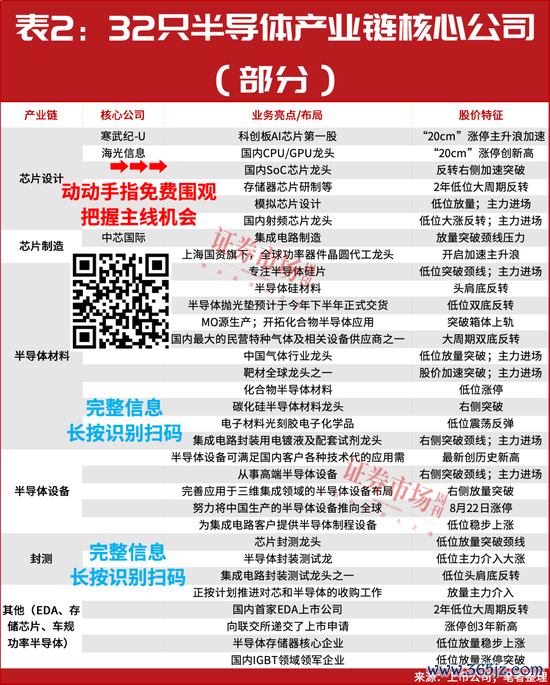 今天,跟全球聊一下牛市必炒的“对的赛说念”之半导体,不管从板块热度照旧寒武纪-U、海光信息最近的“20cm”弘扬来看,都不错考证半导体这个超等板块的主升浪行情已风雅开启。半导体的细分隐形龙头繁多,在龙头“带队”下,好多中枢产业链公司正在开启中低位启动模式,改日的逾额收益契机不排斥就在其中(名单可见文内表2)。