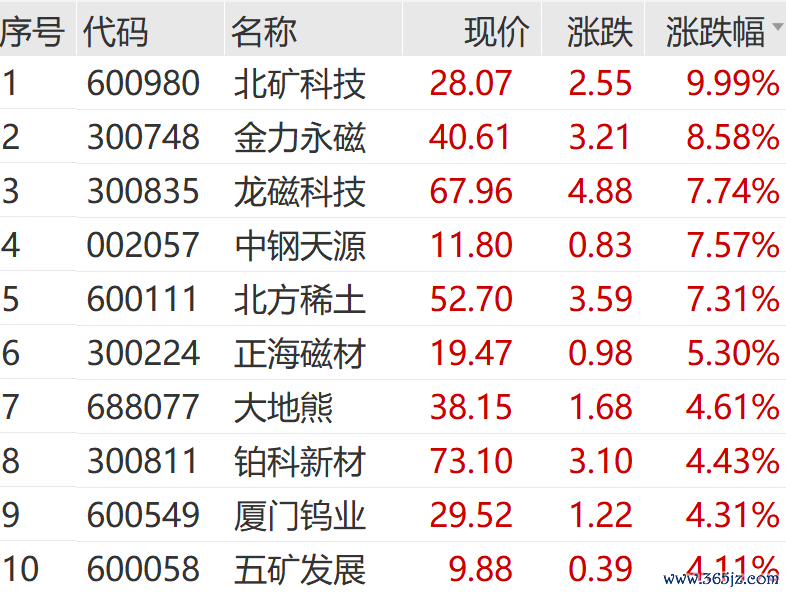 稀土板块再度走高。北矿科技涨停,金力永磁涨超8%,龙磁科技、中钢天源、朔方稀土涨超7%,正海磁材、地面熊等跟涨。