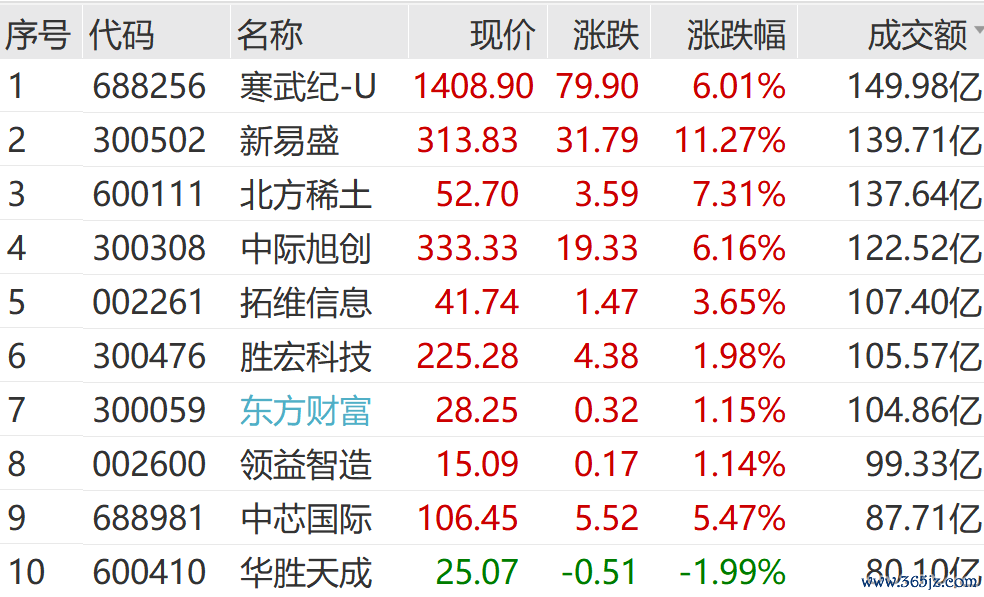 全阛阓半日成交额达1.75万亿元,较上日略有放量;超2200只个股上升。上昼共有7只股票成交额冲破100亿元,分辩是寒武纪、新易盛、朔方稀土、中际旭创、拓维信息、胜宏科技、东方金钱;领益智酿成交额达到99亿元。